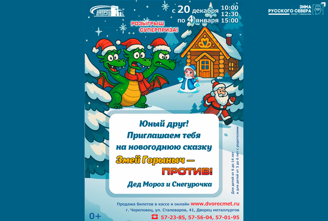 С 20 декабря 2025 г. по 04 января 2026 г. во Дворце металлургов новогодняя сказка «Змей Горыныч — против!» (с участием артистов молодёжного цирка «Супер-Скок»)