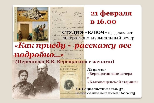 Первый вечер — «Как приеду — расскажу всё подробно…» (переписка В. В. Верещагина с женами) — состоится 21 февраля в 16:00.