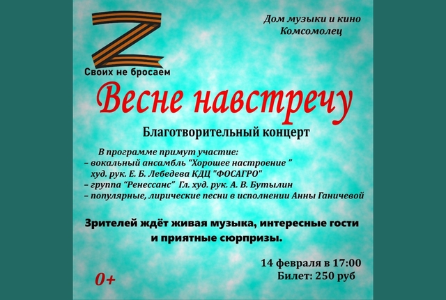 14 февраля 17:00 — благотворительный концерт «Весне навстречу» (0+) в поддержку участников СВО в Доме музыки кино «Комсомолец»