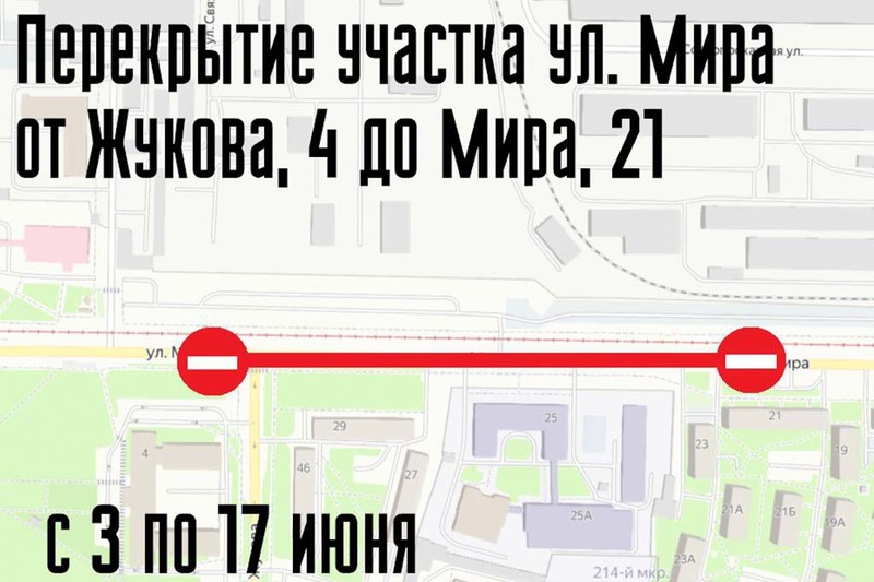 С 3 апреля по 3 июня будет перекрыт участок от улицы Жукова до дома на Мира, 21. Перекресток Мира — Жукова останется открытым для проезда. Затем, с 3 по 17 июня, будет перекрыт участок от здания на Жукова, 4 до дома на Мира, 21. Ограничения связаны с работами по реконструкции улицы Мира.