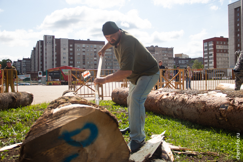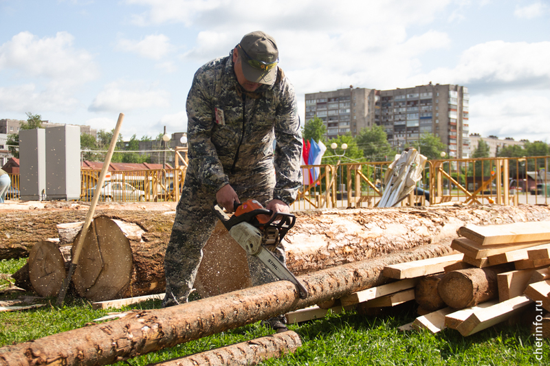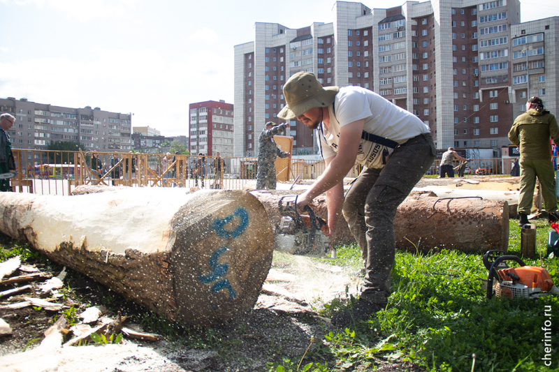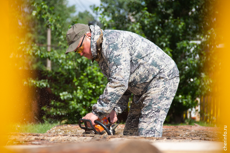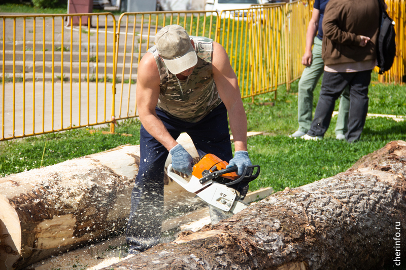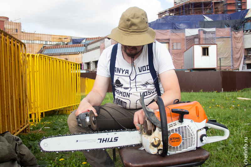«С деревом работать сложнее, чем со льдом: оно имеет структуру, волокна, надо понимать строение, материал ограничен круглой формой, которую нужно вписывать в будущую скульптуру. Мы будем делать солдата, спасающего ребенка. На мысль подтолкнули события в Беслане, когда террористы захватили школу. На мой взгляд, это наиболее ярко отражает сущность русского мира. Фигура будет ростовая, поскольку работу нужно сделать хорошо, а сроки небольшие. Сейчас подготавливаем материал, чтобы меньше тупились цепи и для безопасности», — поделился с cherinfo участник Иван Балаев.