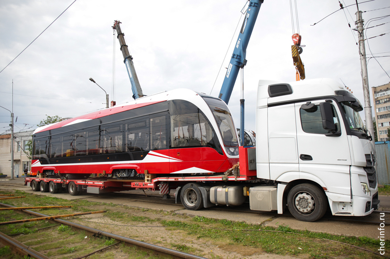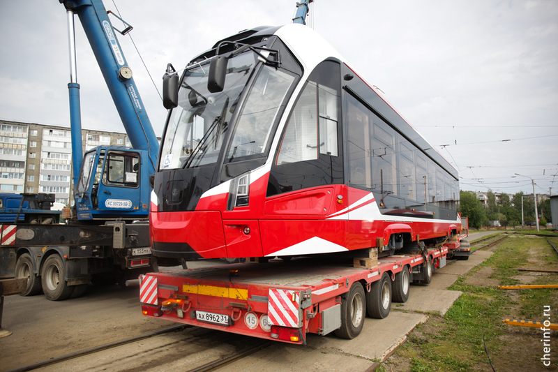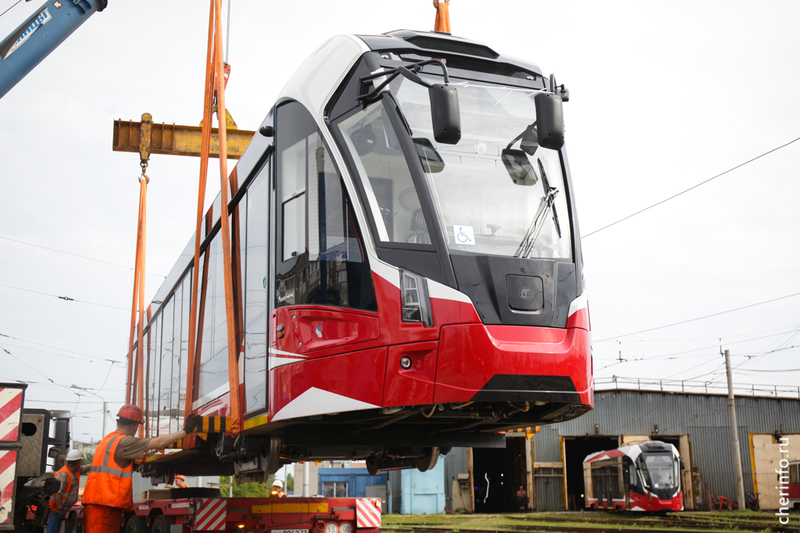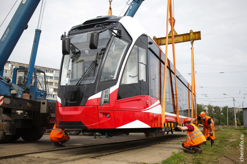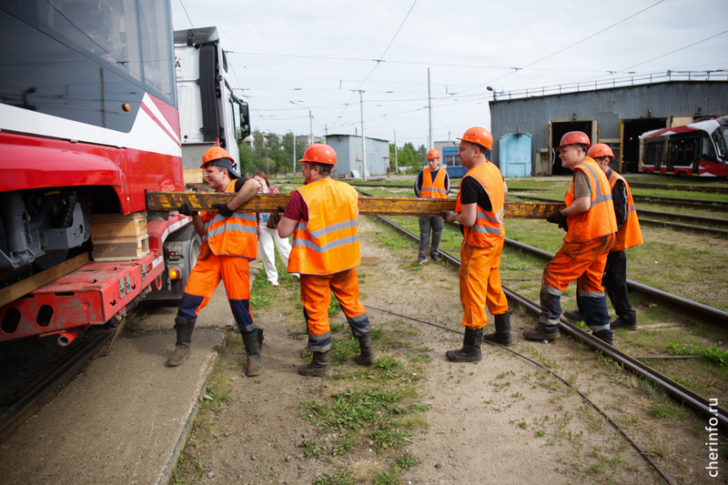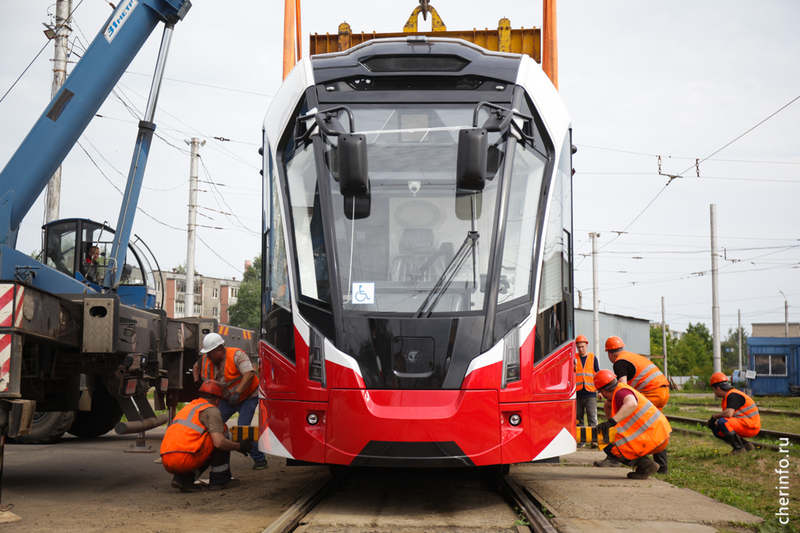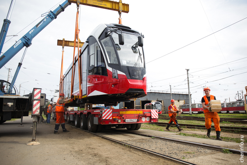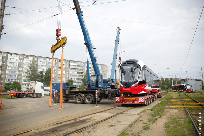 Сегодня «Львят» поставили на рельсы с помощью грузоподъемных траверсов. Это третья поставка запланированных на этот год трамваев: первые два пришли в Череповец 11 июля, еще два — 14 июля. По графику первые трамваи должны были прийти только в августе.