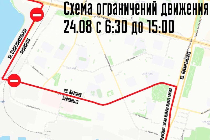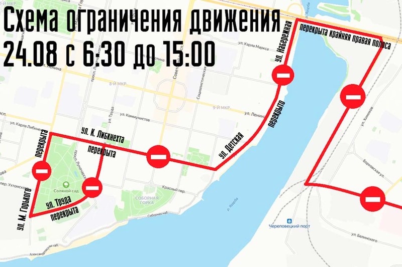 В воскресенье, 24 августа, с 6:30 до 15:00 будут закрыты улицы Суворова, Судостроительная, Красная, Горького на участке от Александровской набережной до Карла Либкнехта, улица Карла Либкнехта, Университетская, Детская, Набережная от проспекта Победы до Ленина, нечетная сторона Шекснинского проспекта от Южного шоссе до Рыбинской. Возможно ограничение движения на других улицах, через которые пройдет забег.