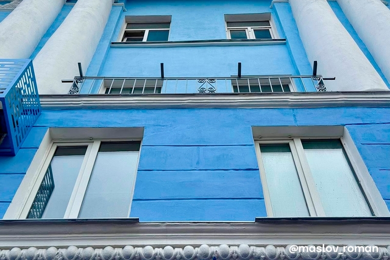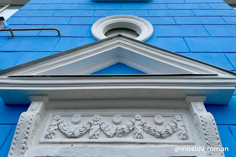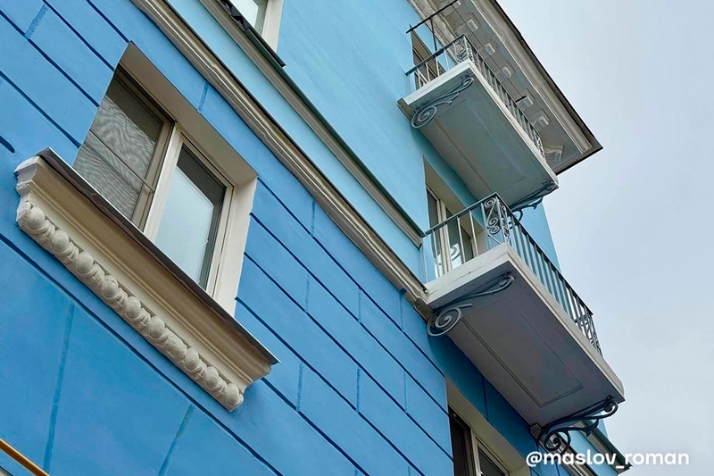Работы начались весной. Рабочие перед покраской полностью убрали старую штукатурку, наложили сетку, зашпаклевали стены. Все декоративные элементы на доме восстановили, как и балконные плиты. Третий и четвертый этажи покрасили в светло-голубой цвет, первый и второй — в синий, декоративные элементы — в белый.