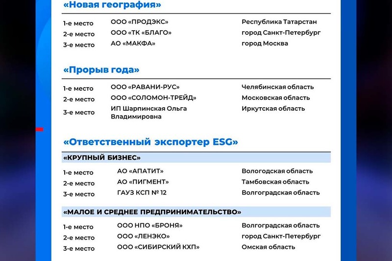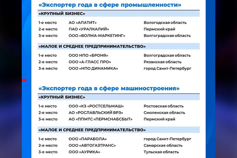Компания «Апатит», входящая в состав «ФосАгро», единственная из Вологодской области вошла в число победителей федерального этапа премии «Экспортер года». «Апатит» выиграл в двух номинациях: «Экспортер года в сфере промышленности» и «Ответственный экспортер ESG» за внедрение экологических технологий.