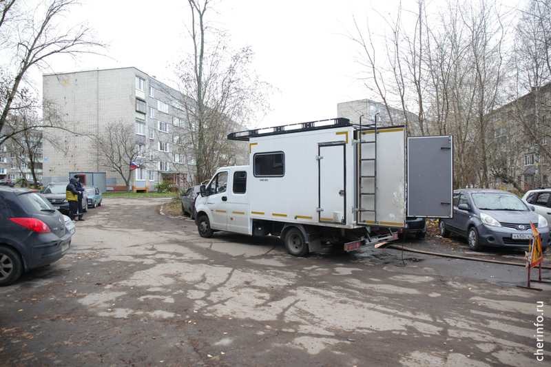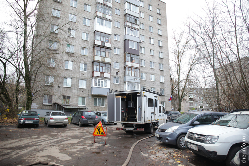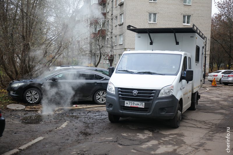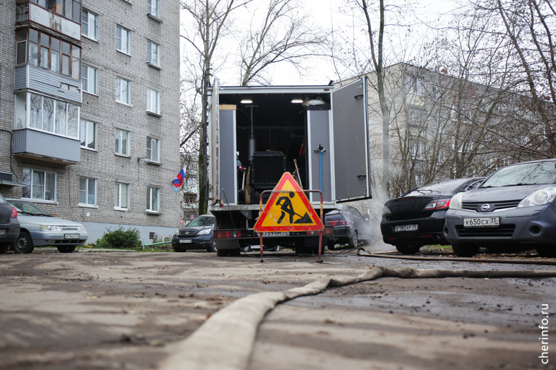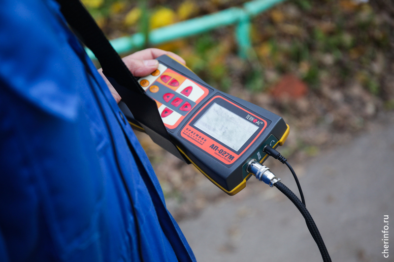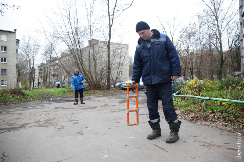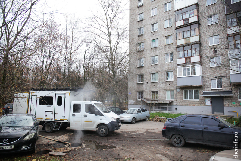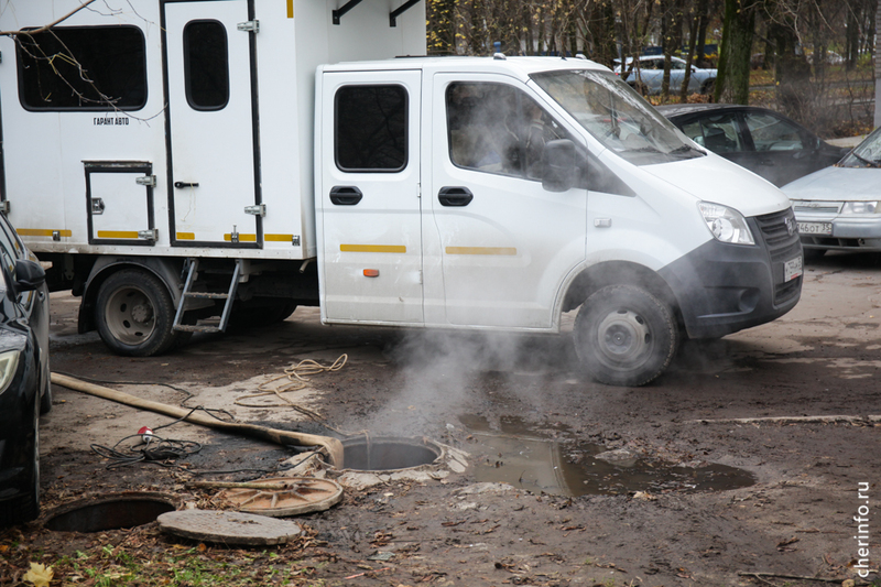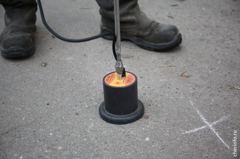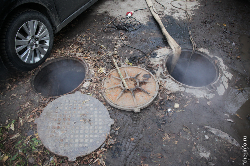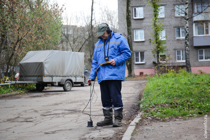 «Здесь мы выявили прорыв трубопровода. С помощью течеискателя обнаружили точку, где нужно провести ремонт. Сначала мы откачиваем воду, потом устраняем прорыв. На время ремонта выключаем отопление», — пояснил cherinfo заместитель главного инженера «Теплоэнергии» Михаил Богданов.