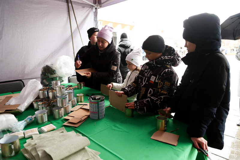 На площади также работала военно-патриотическая площадка, где можно было изготовить блиндажные свечи и сплести маскировочные сети.