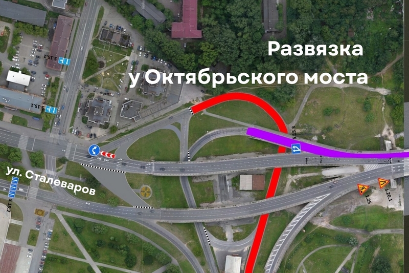 Движение по Октябрьскому проспекту и улице Раахе останется без изменений. Съезд из Зашекснинского района в Индустриальный на Парковой пока сохранится по временному участку — эстакада № 1 еще в ремонте.