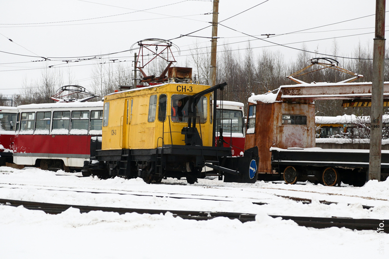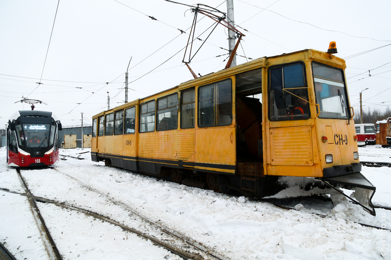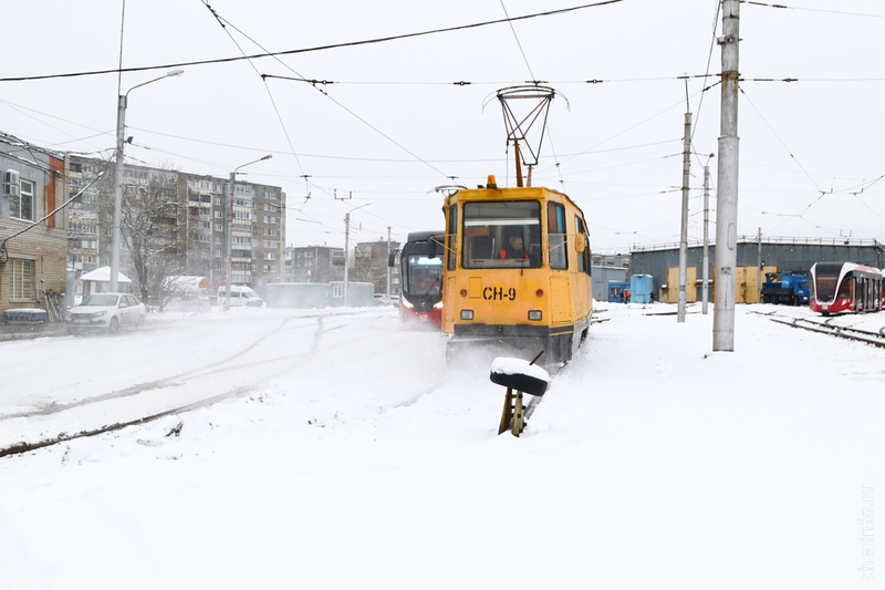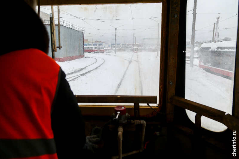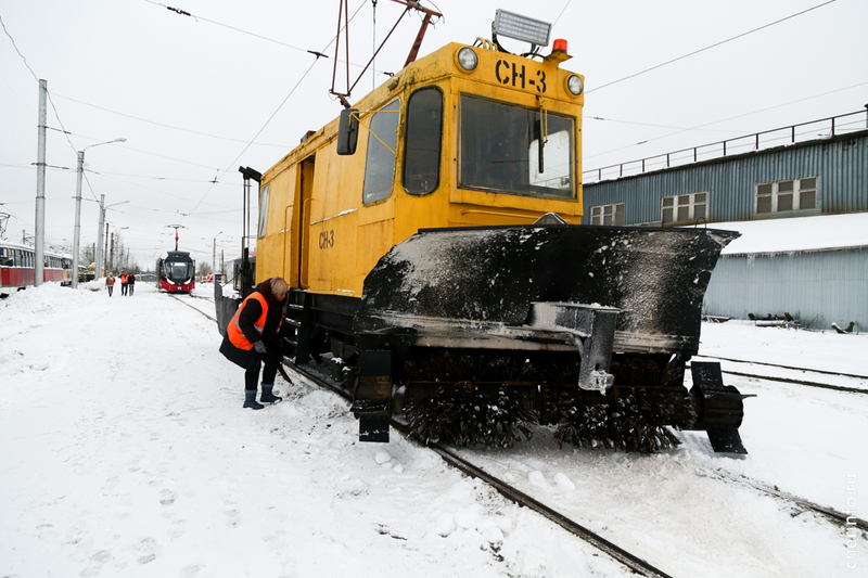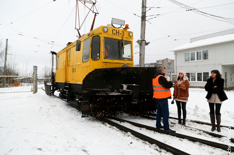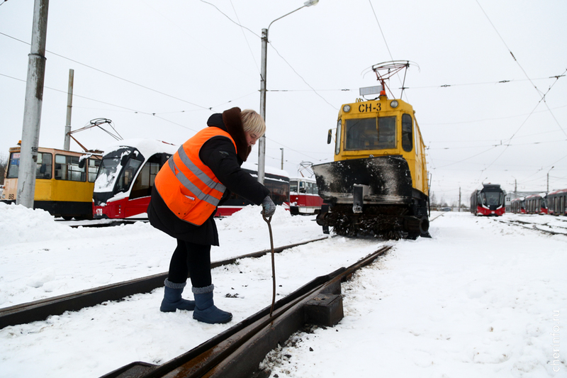 «На вагон мы установили вихревой вентилятор, который сдувает легкий снег с рельсов. Мокрый и залежавшийся снег убирает снегоочиститель. На нем установлен вал с щетками. Мы его модернизировали и сделали сбоку отвал, который сталкивает снег с путей. Следом едет техника „Спецавтотранса“ и убирает. Спецсоставы выходят при необходимости. Спецчасти на рельсах чистим вручную. Если над головкой рельса больше 100 миллиметров снега, трамваи не имеют права продолжать движение. Об этом сообщают водители. Еще подсыпаем специальную соль на стрелки, чтобы они не замерзали. Всего у нас 27 километров рельсов. Их уборка занимает примерно три часа с остановками, чтобы оборудование не перегревалось» — рассказал cherinfo замдиректора «Электротранса» Сергей Григорьев.
