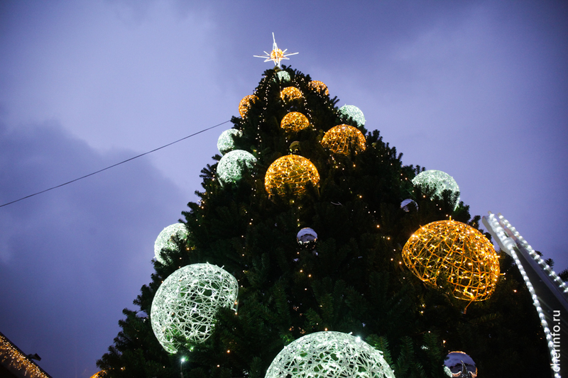 Гирлянды и шары на новогоднем дереве загорелись сегодня с наступлением сумерек.