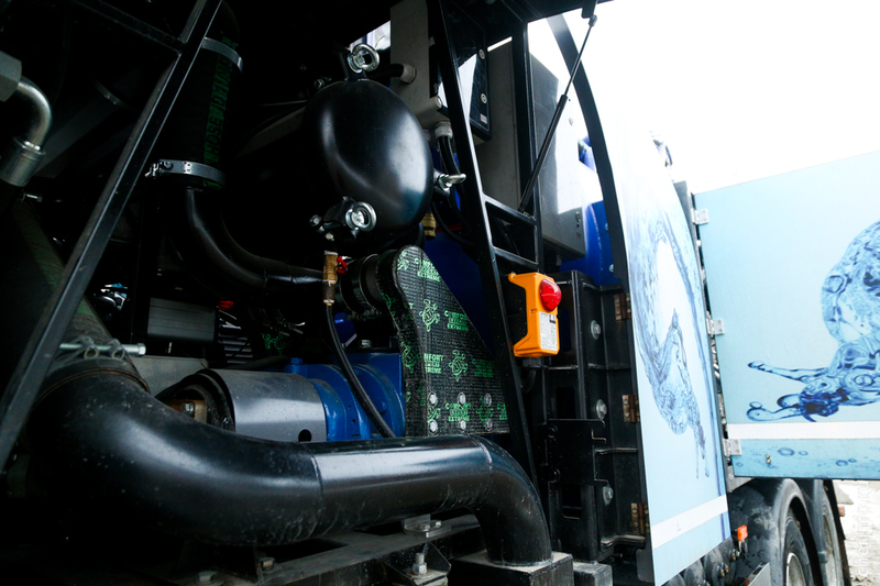 С помощью новой вакуумной каналопромывочной машины чистят канализационные сети среднего и крупного диаметра.