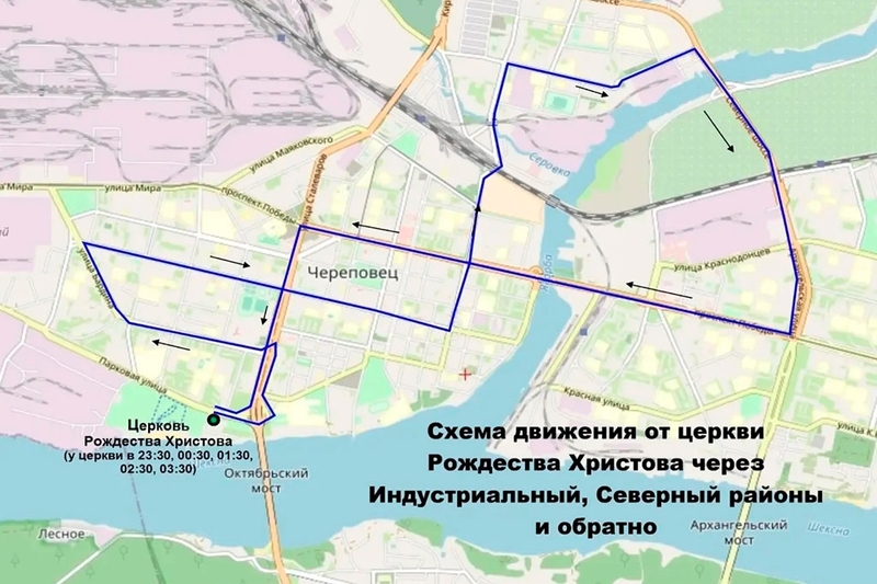 «Первый маршрут будет проходить через Индустриальный район по направлению Северный район, Заречье и обратно. Время отправления: 23:30, 00:30, 01:30, 02:30, 03:30. Второй маршрут пройдет через Зашекснинский в Заречье и обратно через Индустриальный. Время отправления: 23:30, 01:00, 02:30. Автобусы следуют строго по утвержденным схемам с остановками», — написал в своих соцсетях глава Череповца Роман Маслов.