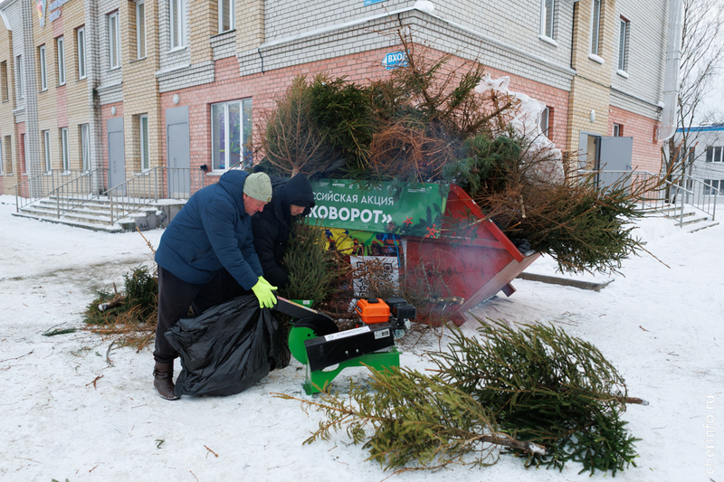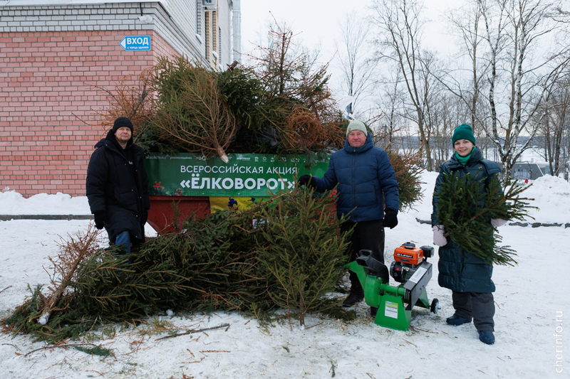 «В этом году наша традиционная акция „дЕльный круговорот“ стала частью всероссийской экологической акции „Елковорот“, которая проводится впервые. Больше 100 елок нам принесли череповчане. Все деревья будут переработаны в мульчу, которую мы передадим „Горзеленстрою“ для подсыпки хвойных растений и гортензий, чтобы защитить их от холода зимой, летнего солнца и сорняков», — рассказал cherinfo зампредседателя Гордумы Андрей Гуляев.
