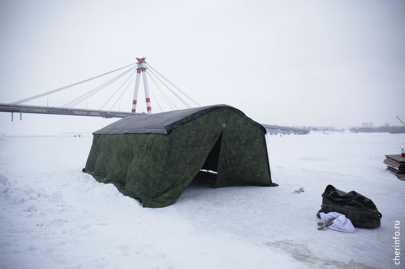 Их размер — три на три метра, глубина — полтора метра. К купелям проложили деревянные настилы, оборудовали раздевалку. Впервые на льду поставили теплый шатер для обогрева.