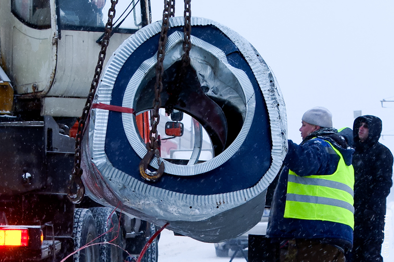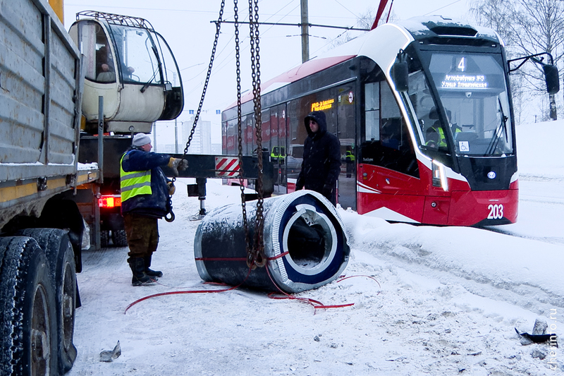 С помощью крана рулон подняли и вновь погрузили на фуру. Движение транспорта было восстановлено.