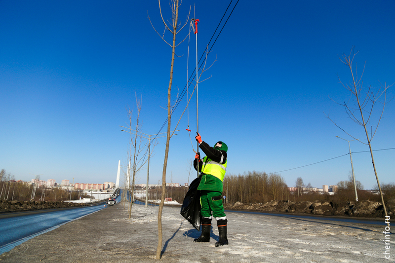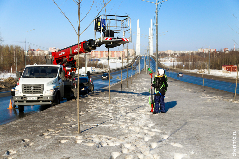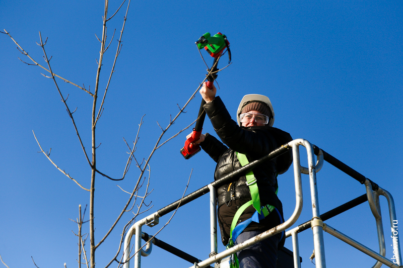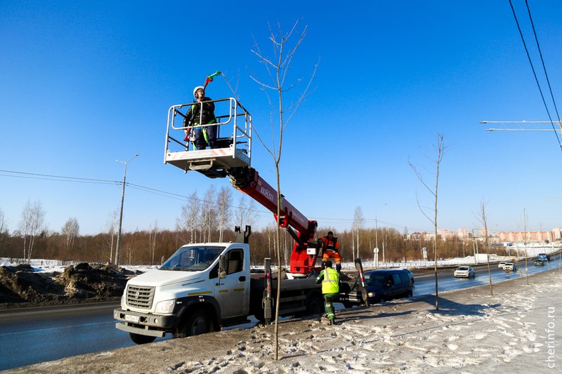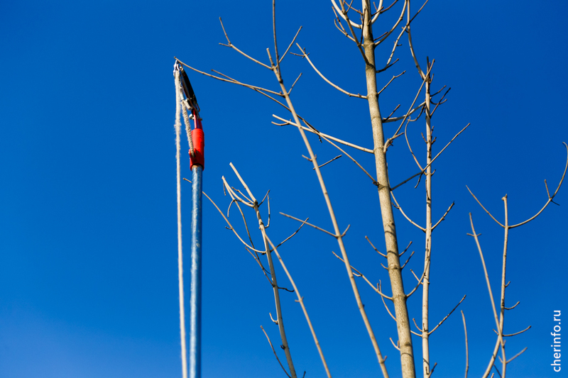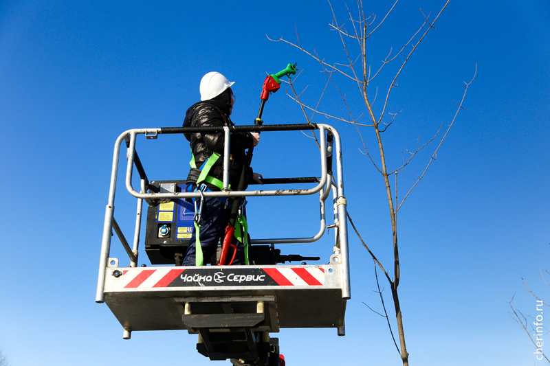«Работаем с вышки и с земли. В зависимости от состояния деревьев, формируем верхнюю точку. У тех кленов, которые не достигли еще своего максимума, оставляем центральный побег и формируем крону, чтобы она нарастала. Деревья обрабатываем спустя почти два года после посадки: мы их не трогали, дали прижиться», — рассказала cherinfo директор «Горзеленстроя» Ирина Аппалонова.