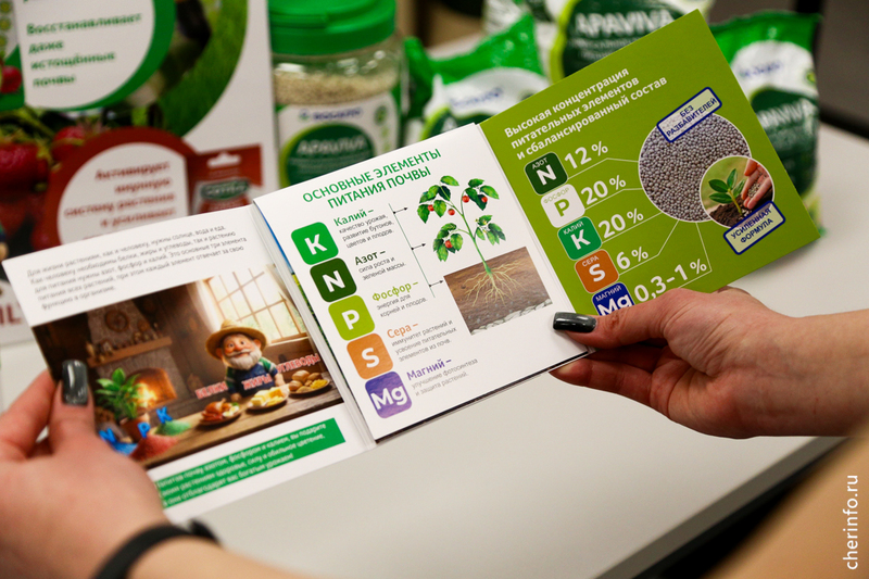 «Наша разработка — адаптоген для растений, он позволяет им адаптироваться к неблагоприятной внешней среде. Рассказываю о наших удобрениях, которые подойдут дачникам. Растениям нужны минеральные вещества для роста, цветения и размножения. Удобрения — это основное питание растений», — пояснил Дмитрий Дорофеев.