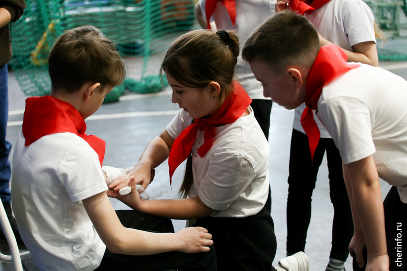Первыми соревновались 16 команд учеников начальных классов. Дети проходили испытания на меткость, оказывали первую помощь, решали тесты и ходили строем.