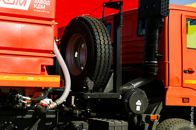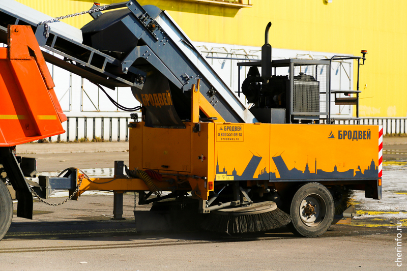 Спецавтомобили выставили у «Окея». Это три комбинированные дорожные машины и два подметально-уборочных прицепа к самосвалу «Бродвей».