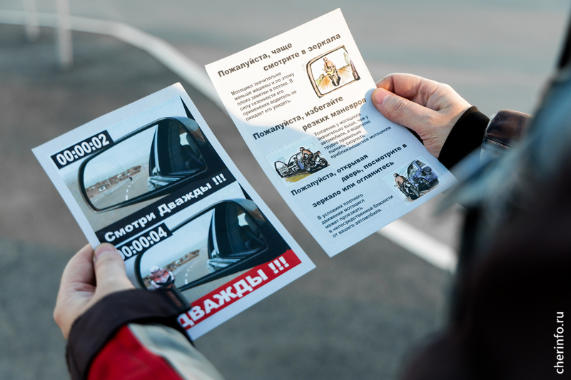 15 апреля на парковке у «Ленты» в Зашекснинском районе мотоциклисты и инспектор ГАИ раздавали водителям машин памятки о том, как избежать ДТП с участием мотоциклистов.