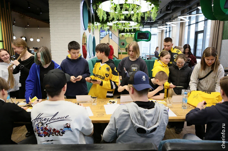 Встреча с болельщиками в формате «открытый микрофон» прошла 14 апреля в ресторане «ПиццаФабрика» на проспекте Победы, 101. На вопросы гостей отвечали хоккеисты «Северстали» Никита Камалов, Макар Фомин и Егор Смирнов, игроки «Алмаза» Глеб Баюшев и Лев Волженков.